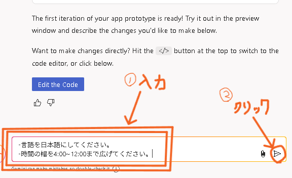 このままでは、英語で分かりずらいのとリマインダーの朝の時間が短いので日本語のアプリにしてリマインダー指定時間の範囲を広げます。以下のように入力したので▶ボタンを押して修正を依頼します。